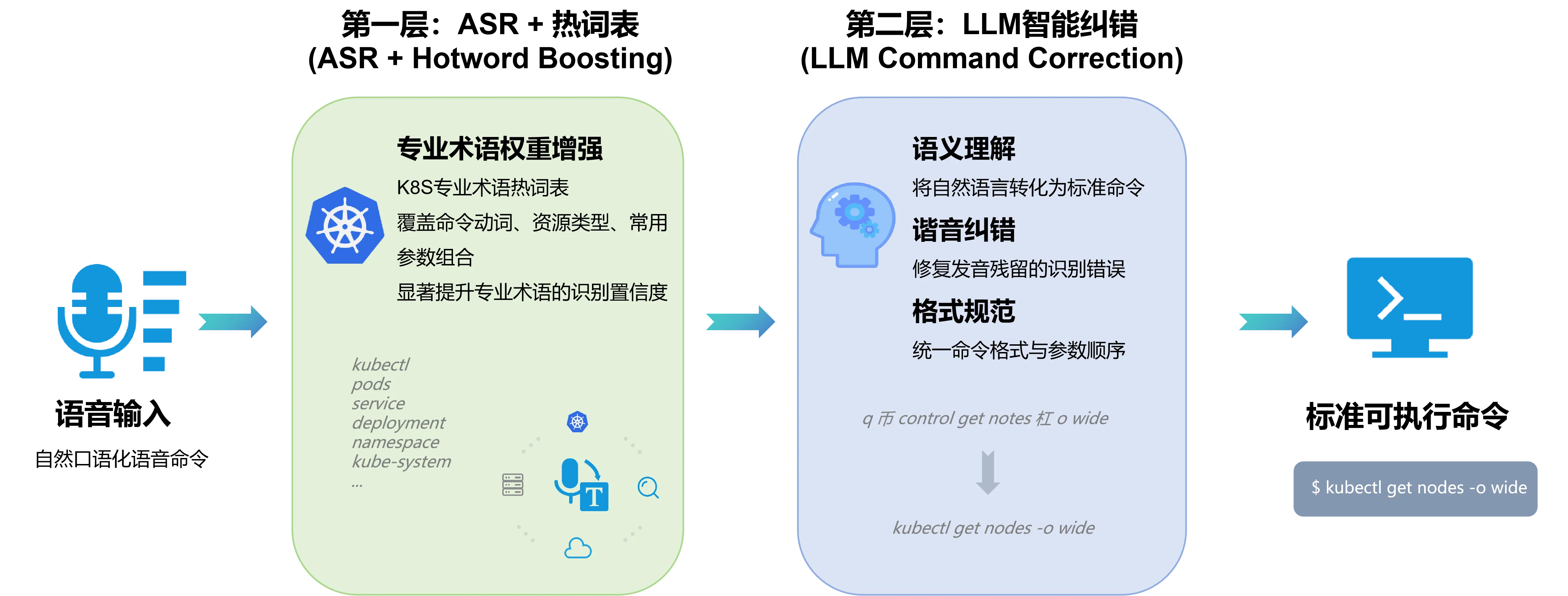 - 处理流程:分为两个阶段执行,先完成ASR残留的谐音纠错(文本矫正),再进行K8s命令格式规范化(结构补全)。