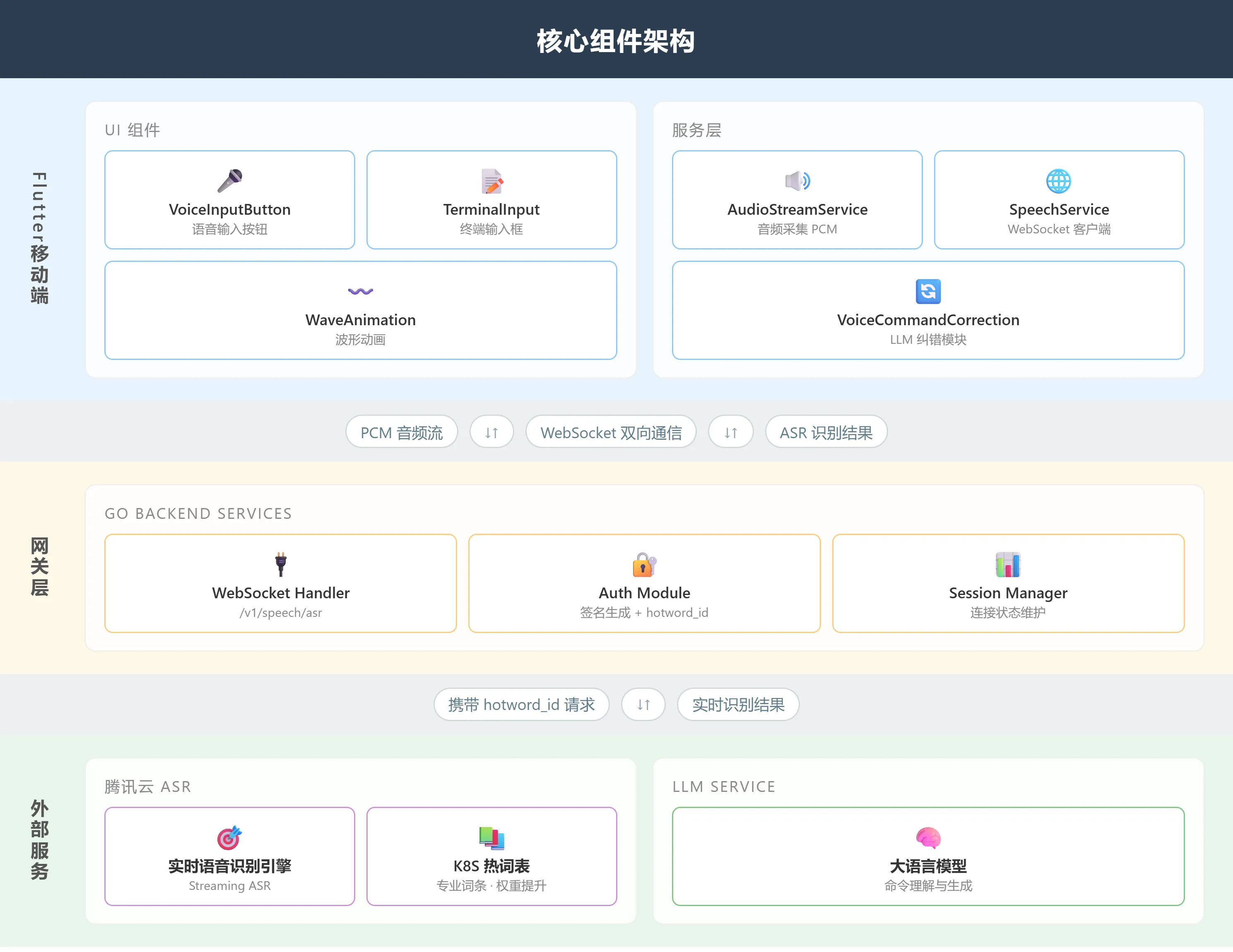 Flutter 移动端: 架构分为用户界面(UI)组件与服务层两大模块。在UI层面,VoiceInputButton 组件为用户提供了一个语音输入的接口,并通过WaveAnimation 实时反馈用户的操作状态;而在服务层面上,AudioStreamService 负责处理PCM格式的音频流采集工作,SpeechService 则封装了基于WebSocket协议的数据传输逻辑,同时,VoiceCommandCorrection 模块封装了精心设计的Prompt,实现了对大型语言模型(LLM)进行调用来完成语音命令的纠正功能。