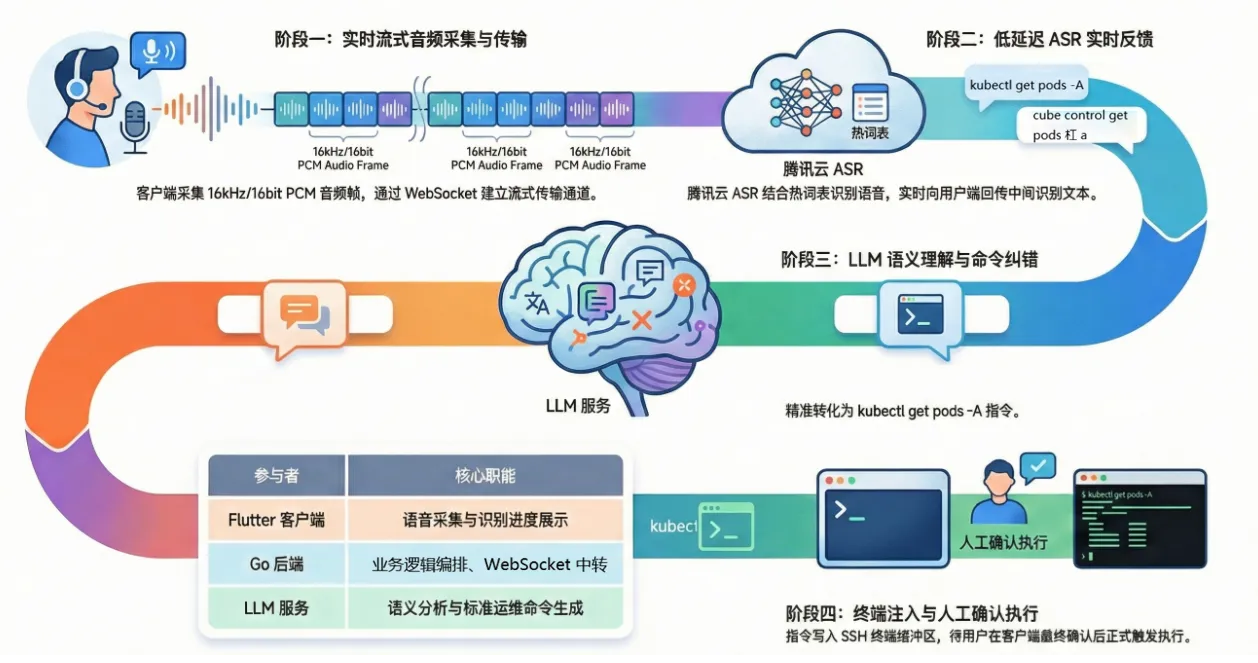 - 识别挑战: 由于“kubectl”等词汇在非运维语境下容易被误识别,系统通过挂载运维热词表(hotword_id)来增强准确性。