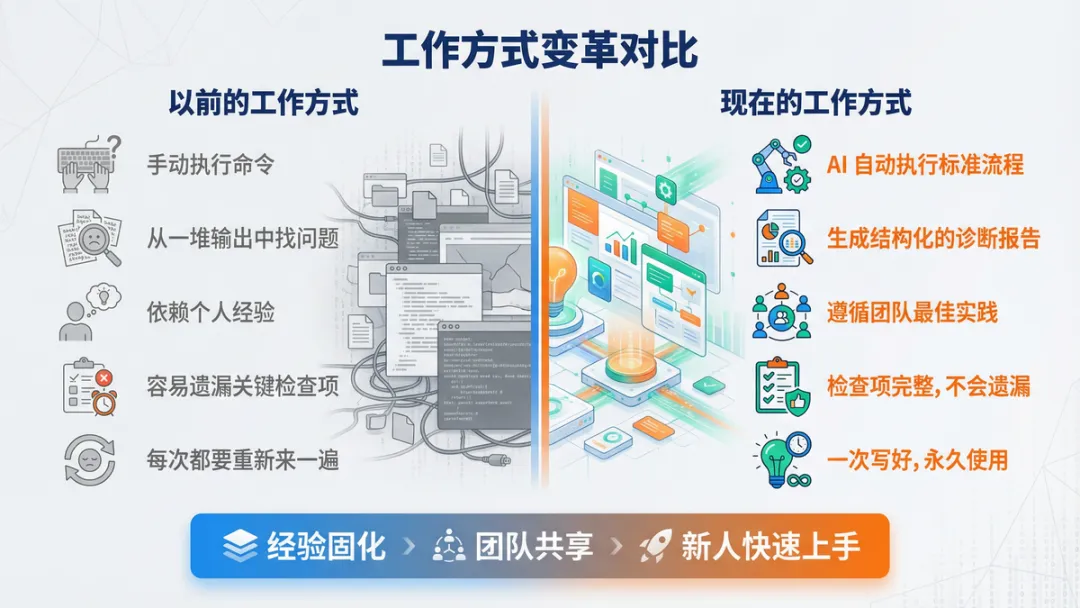 Skills 不是要替代运维工程师,而是让 AI 助手真正成为你的"专家助手"。它把你的经验固化下来,让团队共享,让新人快速上手。