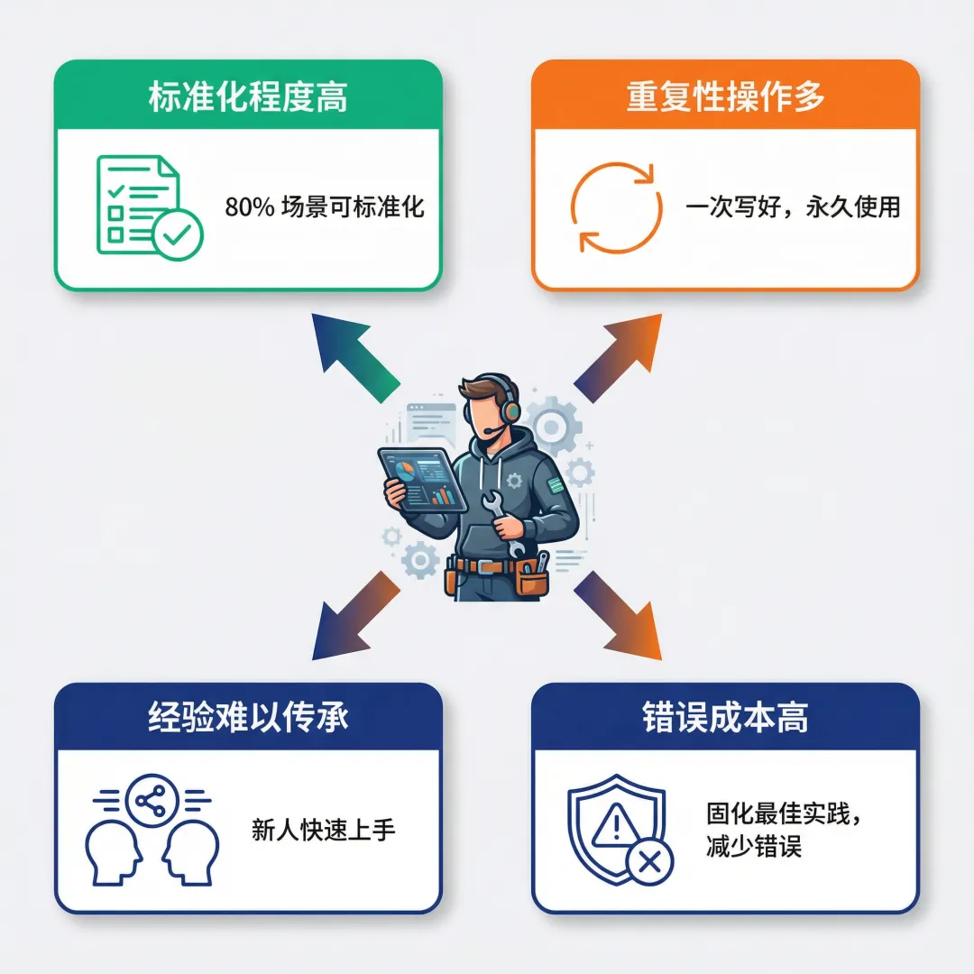 生产环境操作错了,可能造成严重后果。Skills 把最佳实践固化下来,减少人为错误。