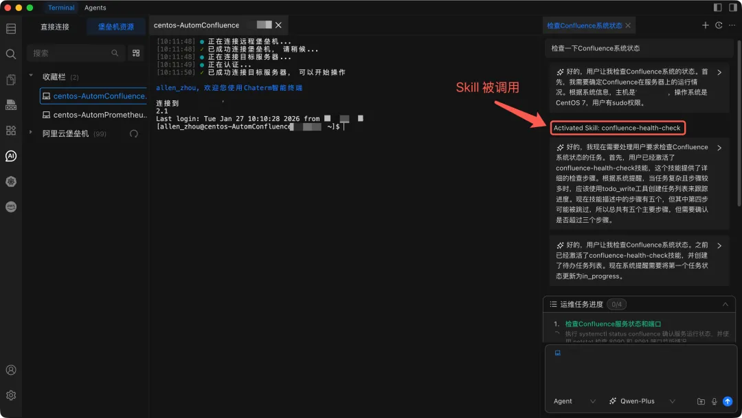 通过深度集成千问大模型,Chaterm 的 Agent Skills 可以将运维经验"打包"成可执行技能,让AI助手自动执行标准流程。