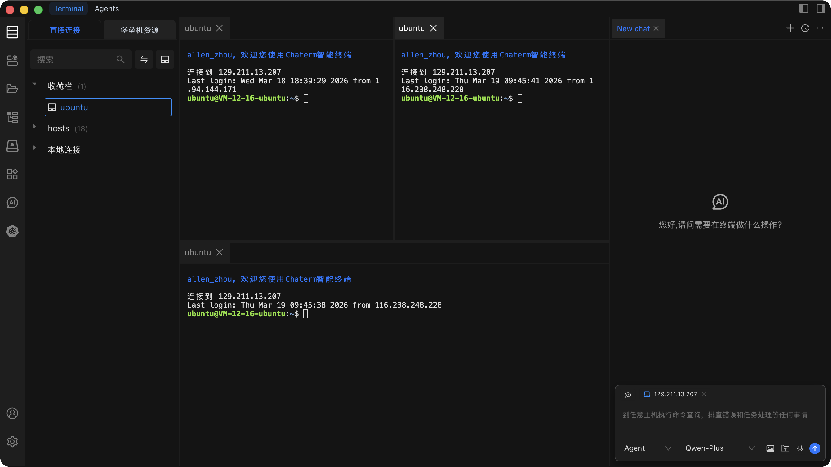 将主机添加到 Chaterm 后,您只需单击即可打开到该主机的 SSH 会话。