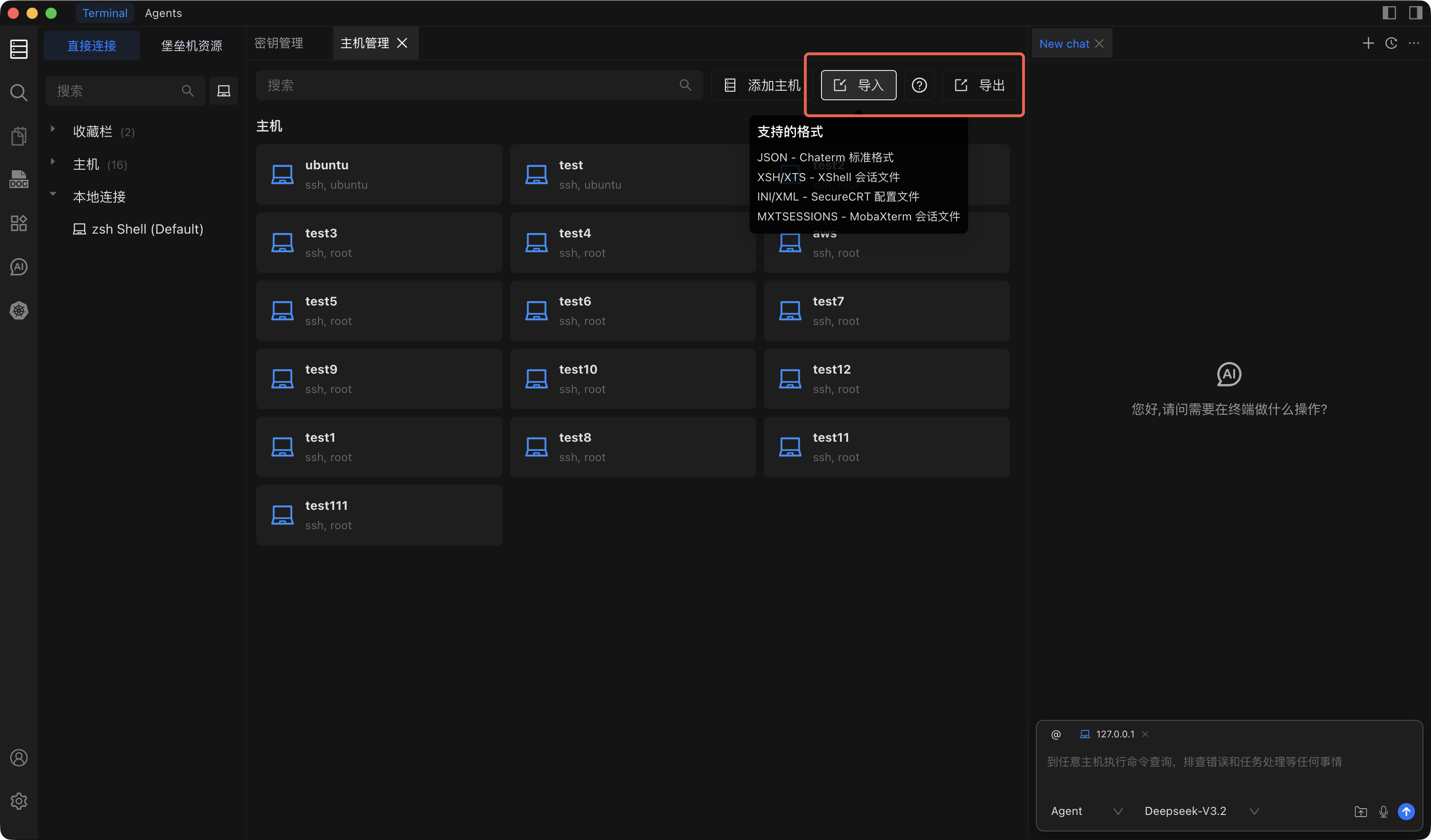 在资产管理界面,点击导入按钮,选择相应的文件可将主机资产导入至 Chaterm 系统。