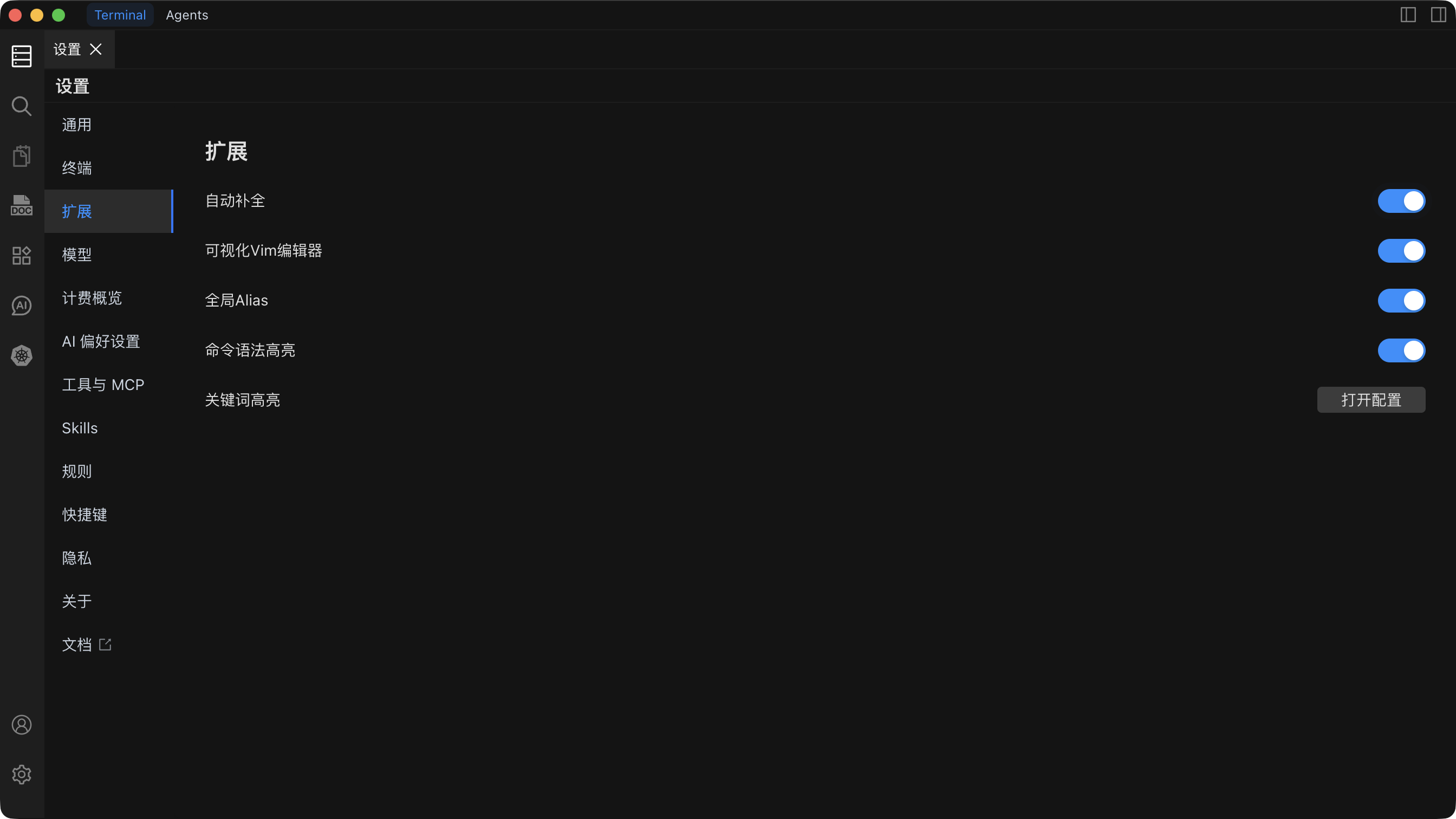 扩展设置用于配置 Chaterm 的增强功能,让您自定义终端的使用体验和工作效率。这些扩展功能可以显著提升命令输入、文本编辑和终端输出的体验。