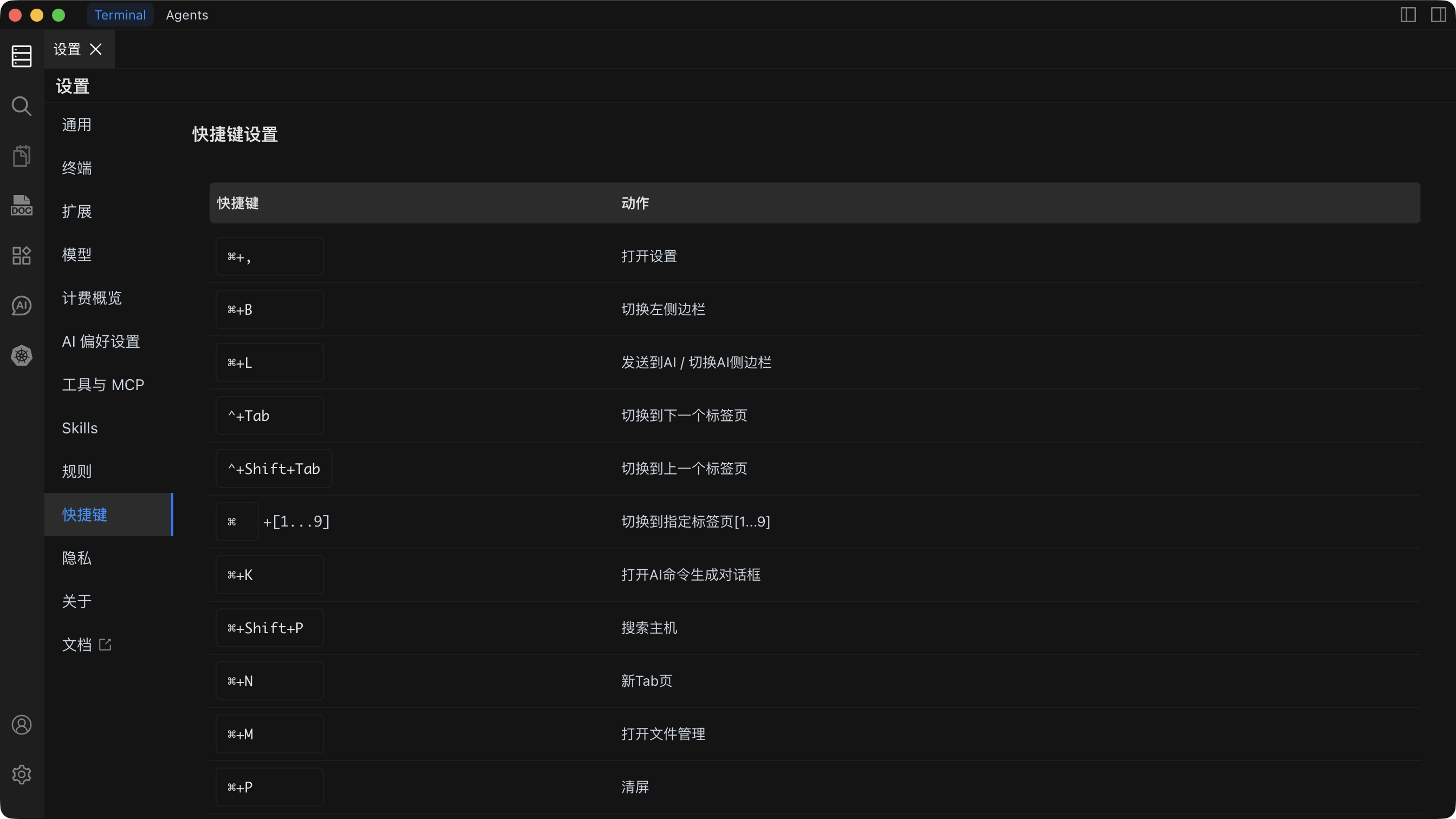 | 切换布局(Terminal/Agents) | Command + E | Ctrl + E |