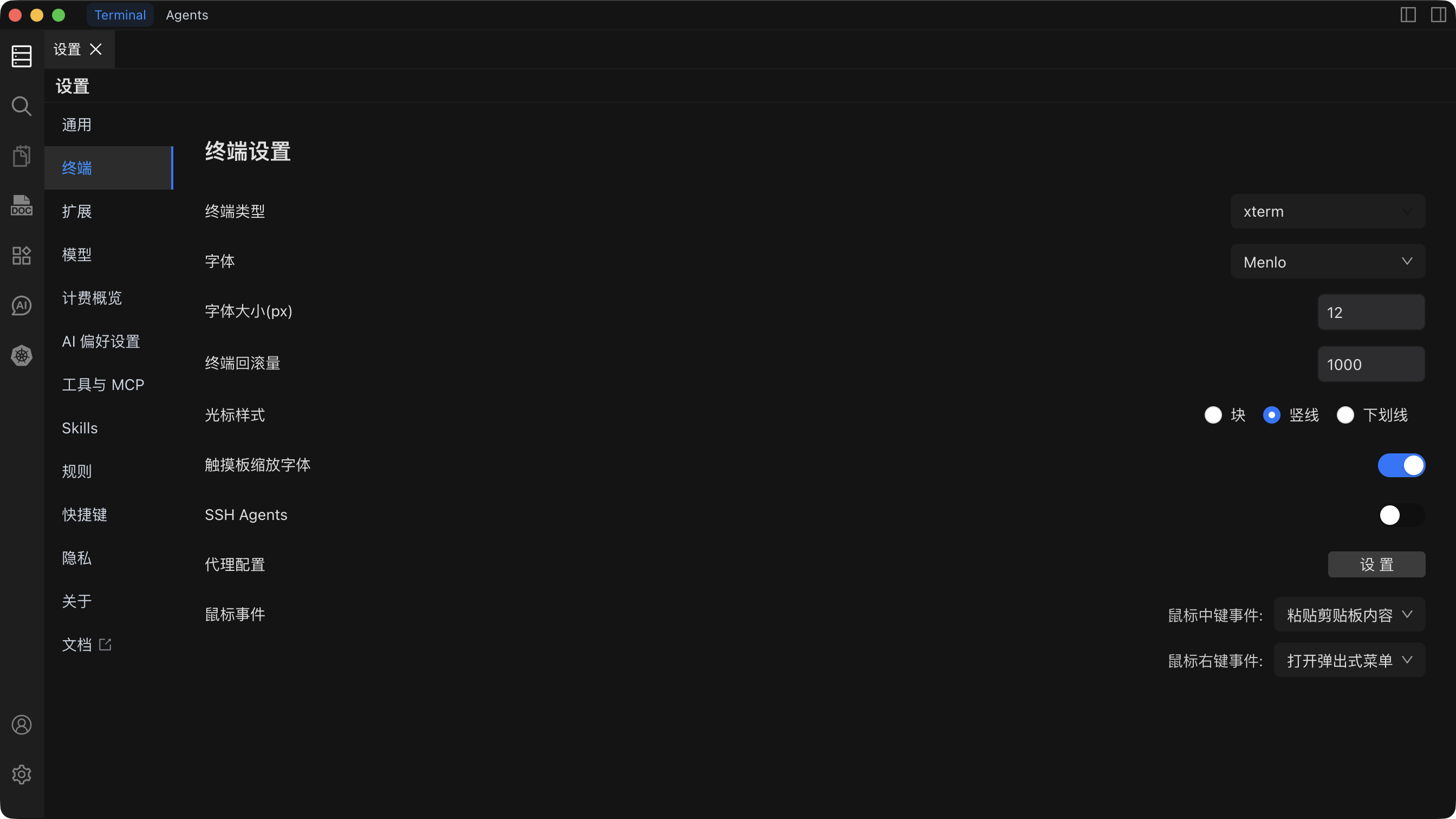 配置终端连接使用的网络代理,用于访问受限网络或提高连接速度。