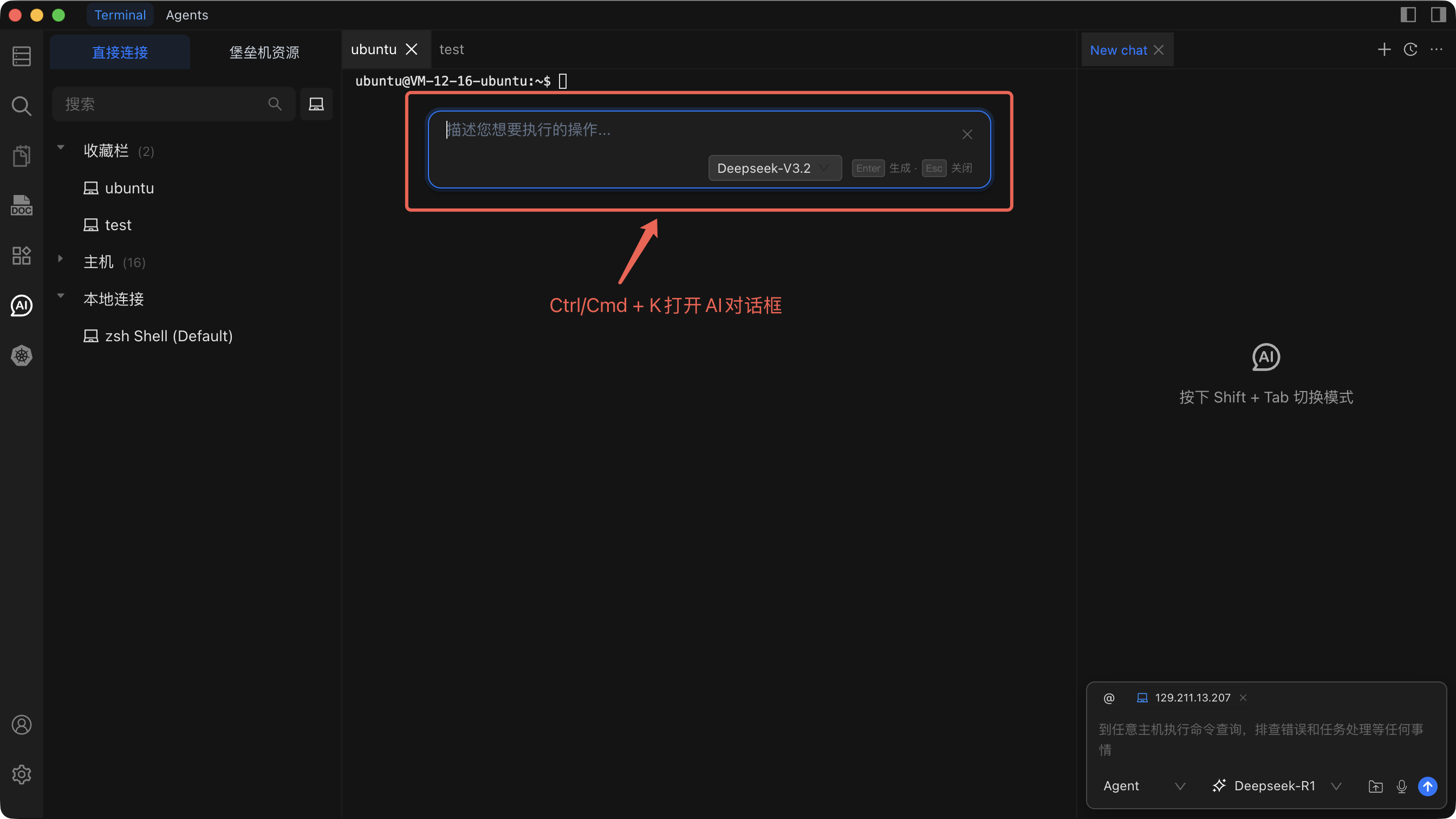 在终端窗口中,使用快捷键可以快速弹出 AI 对话框,输入您想要执行的操作,AI 会帮助您完成终端运维任务。