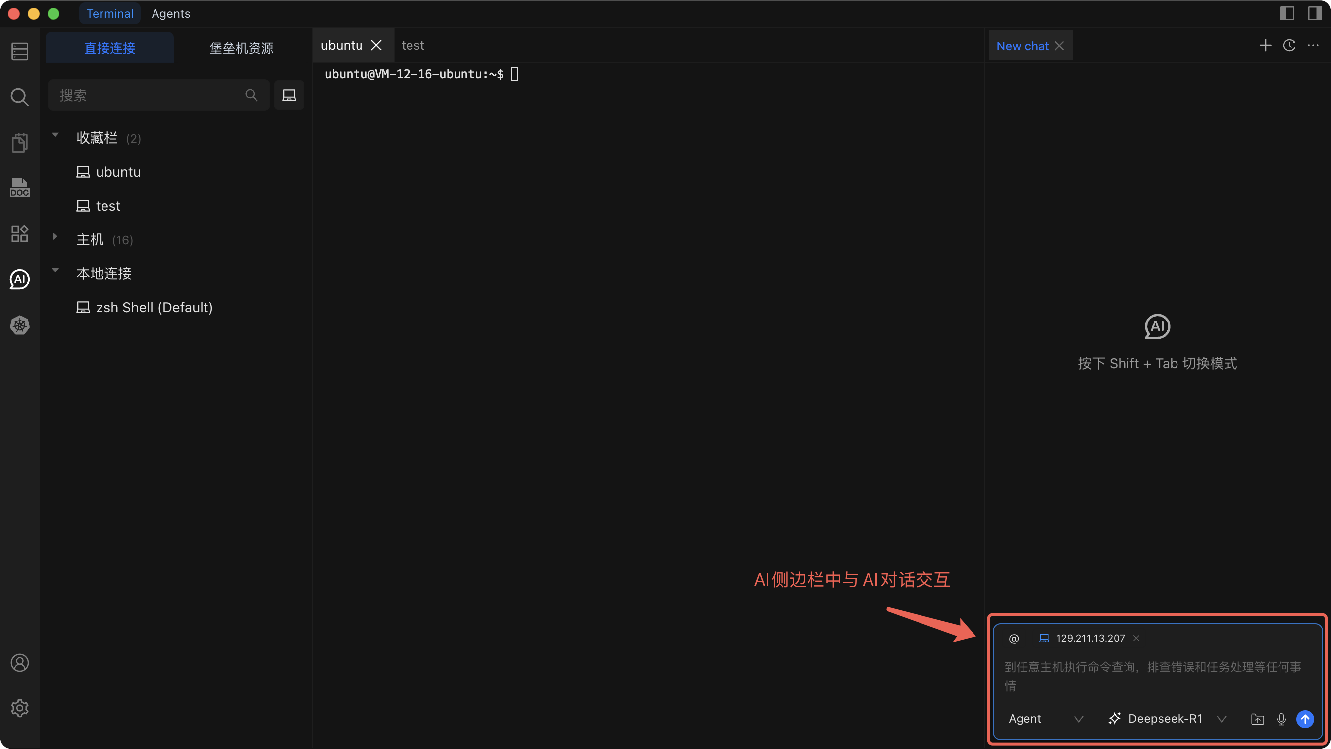 Chat to AI 功能让您可以在终端中直接与 AI 交互,AI 会帮助您完成终端运维任务。